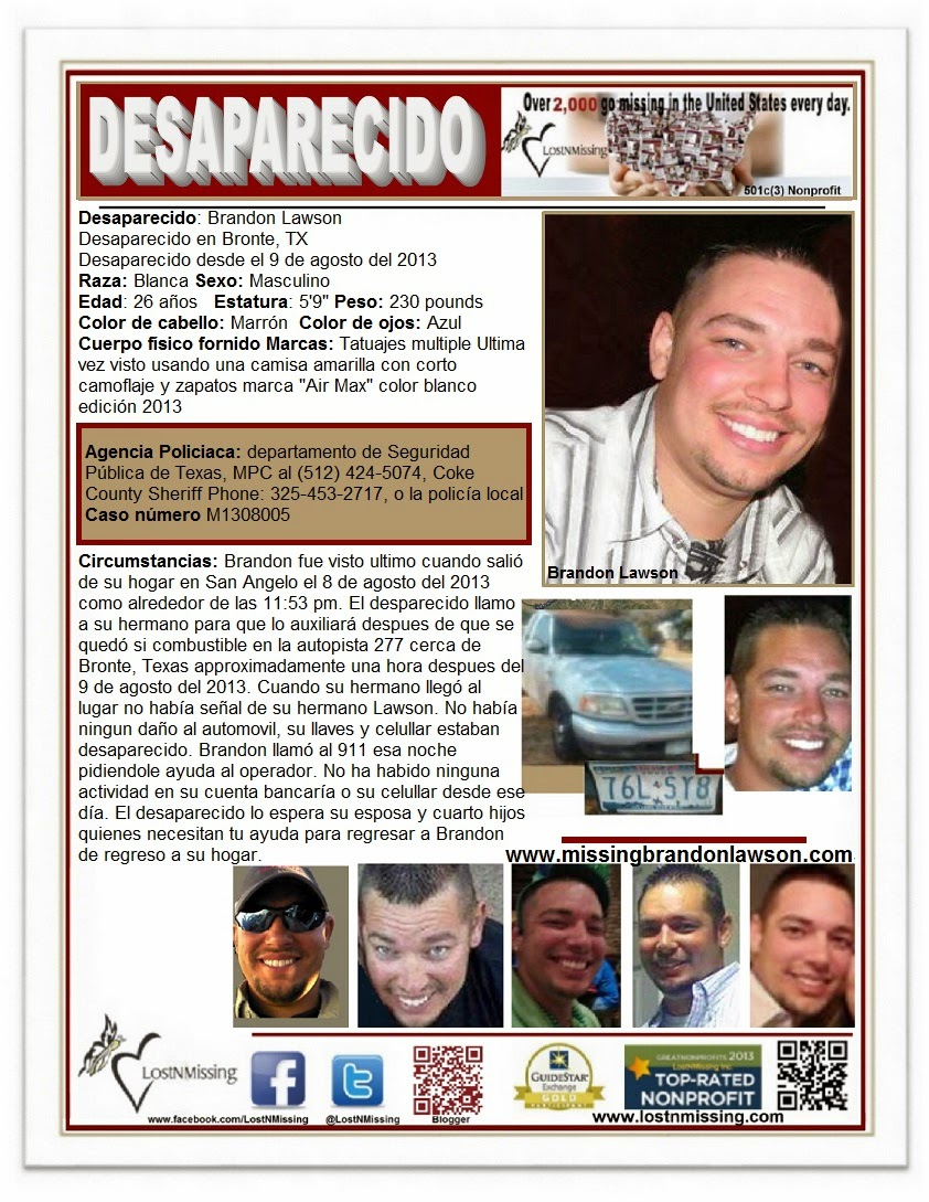 Circumstancias: Brandon fue visto ultimo cuando salió de su hogar en San Angelo el 8 de agosto del 2013 como alrededor de las 11:53 pm. El desparecido llamo a su hermano para que lo auxiliará despues de que se quedó si combustible en la autopista 277 cerca de Bronte, Texas approximadamente una hora despues del 9 de agosto del 2013. Cuando su hermano llegó al lugar no había señal de su hermano Lawson. No había ningun daño al automovil, su llaves y celullar estaban desaparecido. Brandon llamó al 911 esa noche pidiendole ayuda al operador. No ha habido ninguna actividad en su cuenta bancaría o su celullar desde ese día. El desaparecido lo espera su esposa y cuarto hijos quienes necesitan tu ayuda para regresar a Brandon de regreso a su hogar.