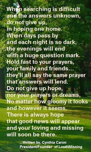Our prayers for needed answers and that Brandon be located soon. We will never give up and will do all possible to bring him home. Hugs, hopes and prayers...always. The Team at LostNMissing Inc.